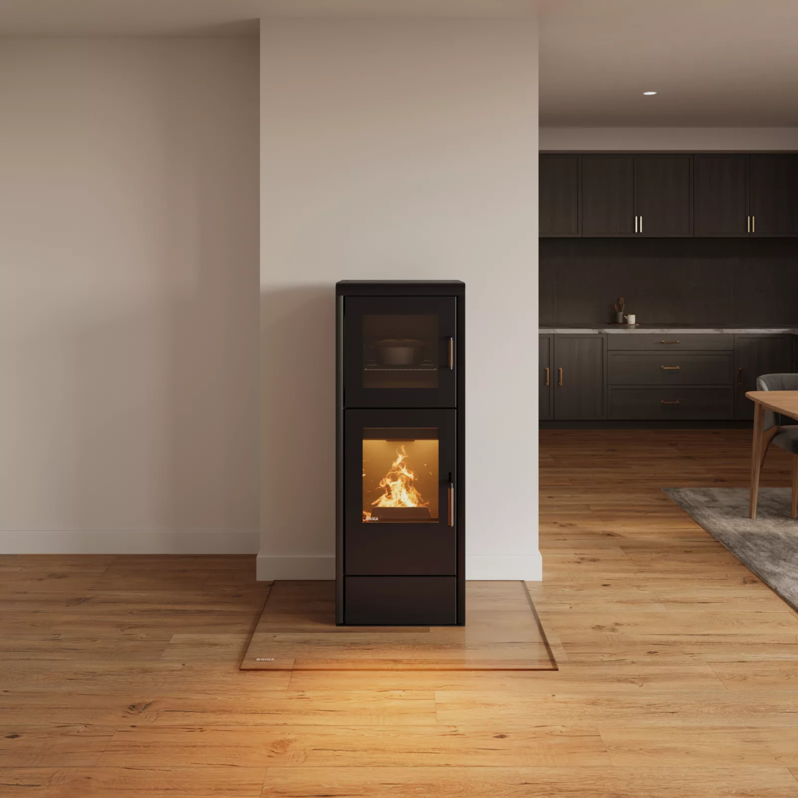Der RIKA BACK Kaminofen verfügt über ein integriertes Backfach und ermöglicht Ihnen die zusätzliche Nutzung der Wärme für die Zubereitung leckerer Gerichte oder zum Backen. Im Gegensatz zu vielen anderen Herstellern setzt RIKA auf ein emailliertes Backfach anstelle von Lack. Dank der hochwertigen Emaille-Oberfläche ist das Backfach nicht nur außergewöhnlich langlebig, sondern auch besonders hygienisch. Selbst bei hohen Temperaturen bleibt Emaille absolut unbedenklich, während lackierte Oberflächen potenziell schädliche Stoffe auf Lebensmittel übertragen können. Zudem lässt sich das emaillierte Backfach mühelos reinigen und sauber halten. Durch das zusätzliche Sichtfeld haben Sie auch stets die Kontrolle über Ihre Kreationen. Der Stahlkorpus kann durch verschiedene Dekorseitenverkleidungen an Ihren Wohnraum angepasst werden. Der raumluftunabhängige Ofen ist in einem Leistungsbereich von 4.0 - 8.0 kW verfügbar und mit dem RIKA Luftleitsystem (RLS) ausgestattet. Dieses ermöglicht Ihnen über eine einfache Einhand-Bedienung die Steuerung und Optimierung der Luftzufuhr und -verteilung im Ofen.